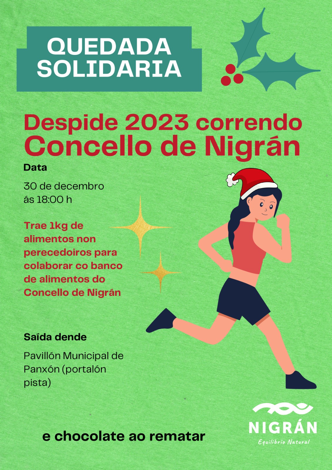 Como é xa tradicional, a San Silvestre de Nigrán é unha quedada solidaria onde os participantes deben achegar 1 kg de alimentos non perecedoiros no mesmo día (desde media hora antes do inicio) para o Banco Municipal sen necesidade de inscrición previa. A carreira non competitiva arrancará ás 18:30 horas no Paseo de Panxón (altura do Pavillón) para chegar ao fin de Praia América en Lourido e volver ao punto de partida. Ao rematar ofrecerase unha chocolatada.