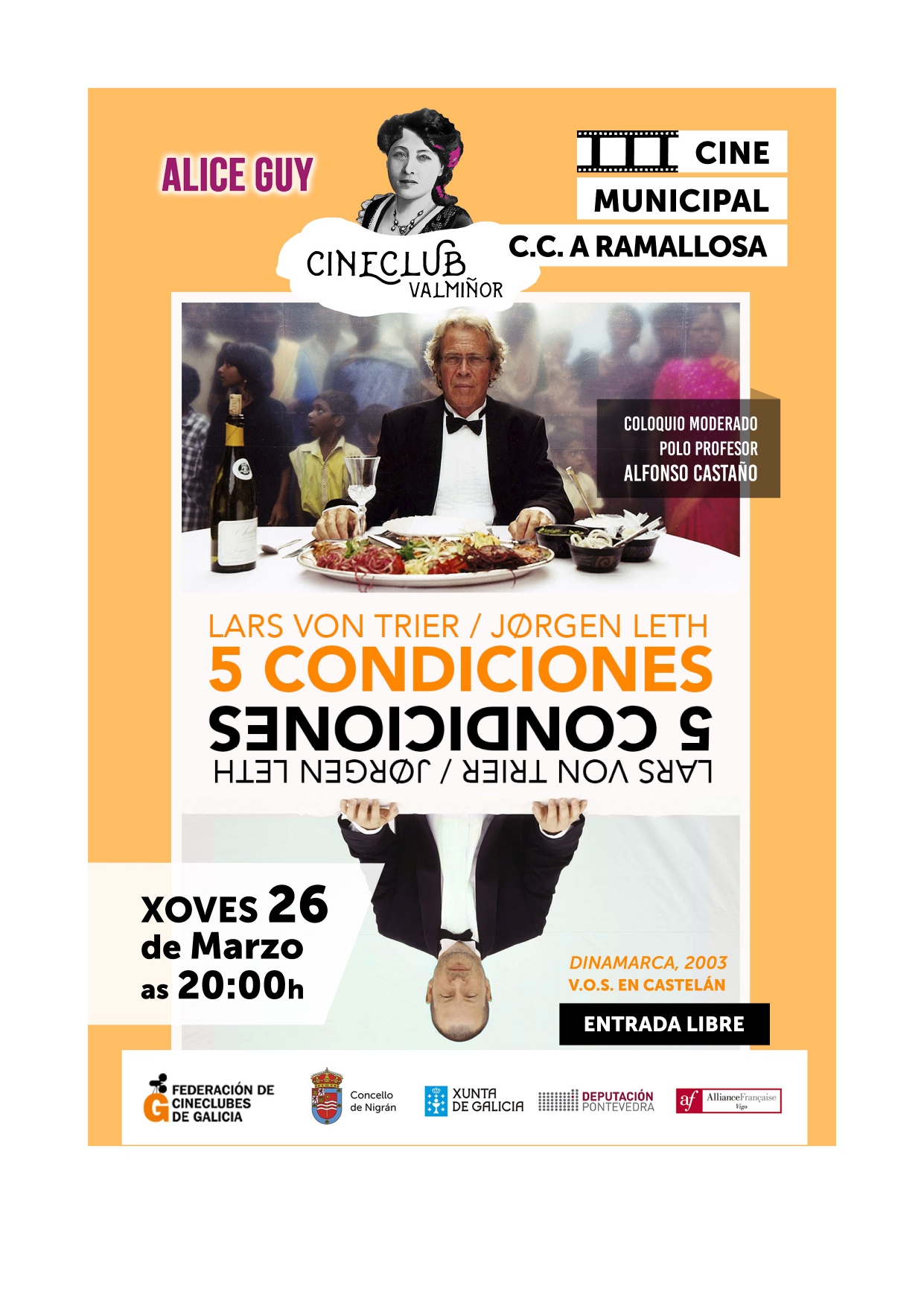 Nigrán, 24/03/26.- O Cineclub Val Miñor Alice Guy ofrece este xoves 26 de marzo coa colaboración do Concello de Nigrán a película de Lars Von Trier ‘Cinco condiciones’ a partir das 20:00 horas no Cine Municipal da Ramallosa. A entrada é de balde ata completarse o aforo.