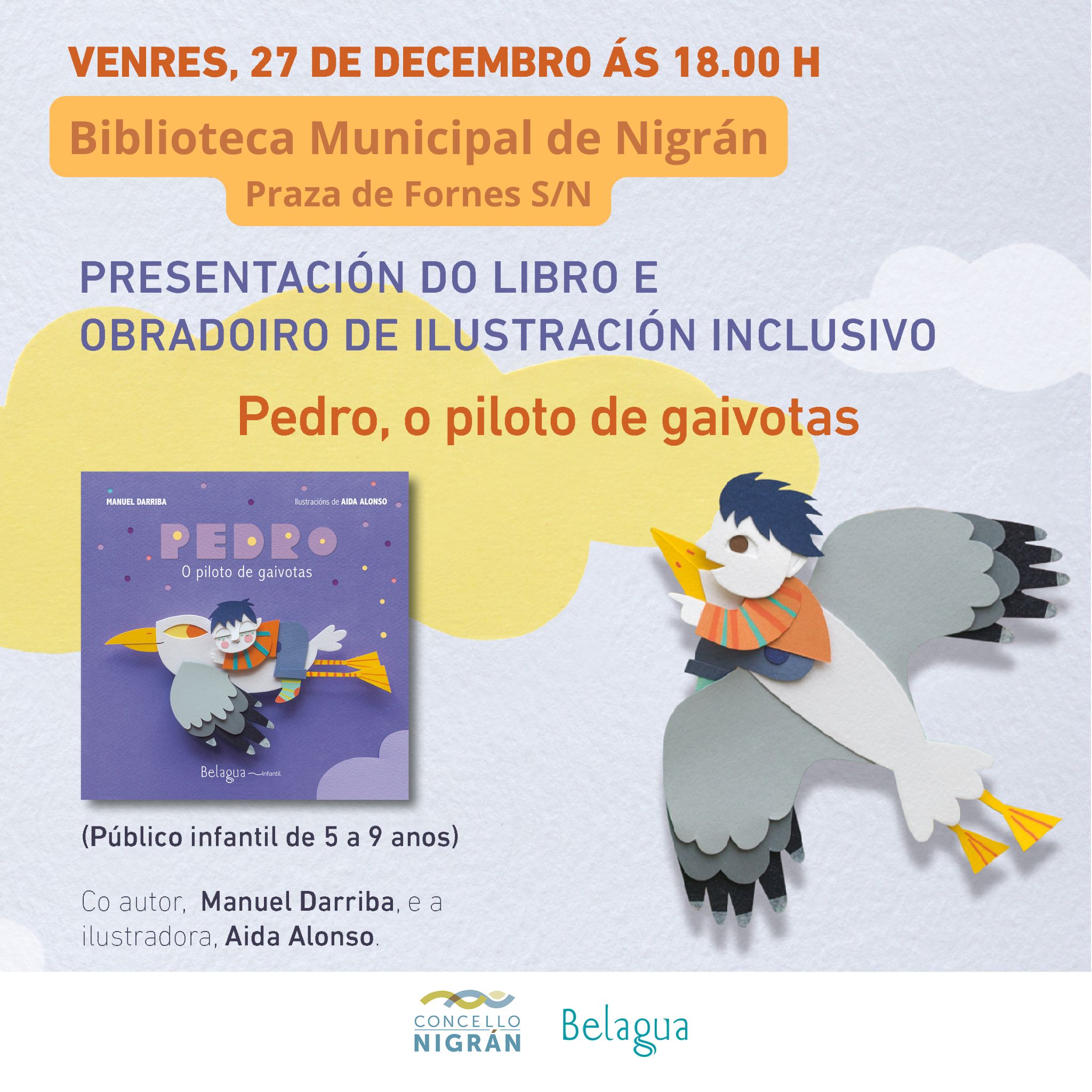 Nigrán, 23.12.24.- O Concello de Nigrán, dentro da súa programación especial de Nadal, presente este venres 27 de decembro ás 18:00 horas na Biblioteca Municipal o libro inclusivo ‘Pedro o piloto de gaivotas’ coa presenza dos seus autores, Manuel Darriba (texto) e Aida Alonso (ilustracións). Eles mesmos dirixirán un obradoiro para crianzas de 5 a 9 anos aos que lle presentarán a Pedro, un neno con discapacidade ao que lle encanta ver mundo, e por iso se fai piloto de gaivotas (cada mañá ven unha á súa casa para levalo de viaxe). No obradoiro cada quen creará a súa personaxe coa técnica do recorte con tesoiras e pegado de cartolinas de cores, tal e como Aida Alonso ilustrou a obra. Non é preciso inscribirse previamente nin levar material.