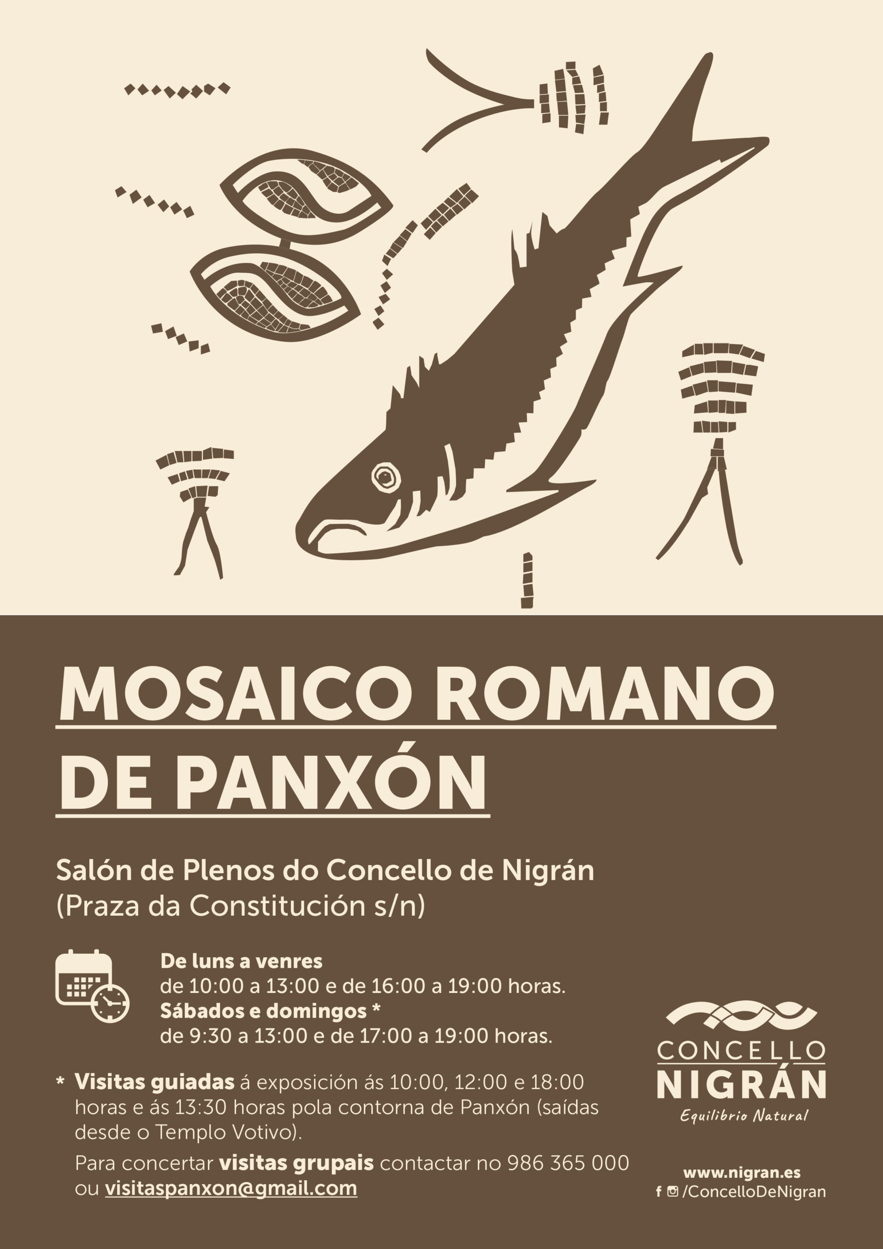 A mesa co devandito mosaico preside un salón de plenos musealizado por Árbore Arqueoloxía e onde figuran restos vinculados coa historia do castro de Panxón (cerámicas e un concheiro), réplicas de obxectos cerámicos da época, muíños de pedra atopados en Panxón, imaxes dalgúns dos restos máis icónicos deste castro e que se atopan en diferentes museos (ara a Mercurio, outro trozo dun mosaico, un puñal óseo, obxectos decorativos…) e, como curiosidade, tamén acompañan a exposición tres imaxes cedidas por Erea Castro do periodo no que o mosaico estivo na casa de Ricardo Blanco Cicerón na Coruña, unha etapa na que foi propiedade desta familia, que o empregaba como mesa de estudo. O propio Benito Vilas, arqueólogo de Árbore, ofrecerá visitas guiadas á mostra os fins de semana ás 10:00, 12:00 e 18:00 horas, e para quen desexe coñecer máis sobre Panxón, organiza tamén visitas guiadas pola parroquia os sábados e domingo ás 13:30 horas (saídas desde o Templo Votivo). Igualmente, o Concello ofrece a posibilidade de concertar visitas de grupo noutros horarios contactando no 986365000 ou no mail visitaspanxon@gmail.com.