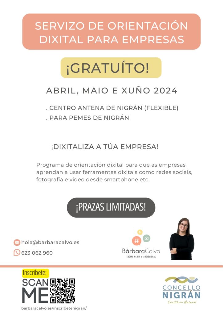 Nigrán, 03/04/24.- O Concello de Nigrán ofrece a partir deste mes un servizo gratuíto destinado a potenciar a comunicación dixital das pequenas e medianas empresas do municipio. Esta iniciativa piloto nace co obxectivo de ofrecer orientación dixital para que aprendan a usar ferramentas como redes sociais, fotografía e vídeo desde o smartphone etc. O servizo, con citas individualizadas atendidas no Centro Antena de Nigrán (Otero Pedrayo, 52), será dirixido por de Bárbara Calvo, freelance de Nigrán especializada na xestión de redes sociais e creación de contido audiovisual. Coa súa experiencia e coñecementos, Bárbara proporcionará un asesoramento personalizado e seguimento continuo a cada participante elaborando un plan de acción adaptable a cadansúas necesidades.