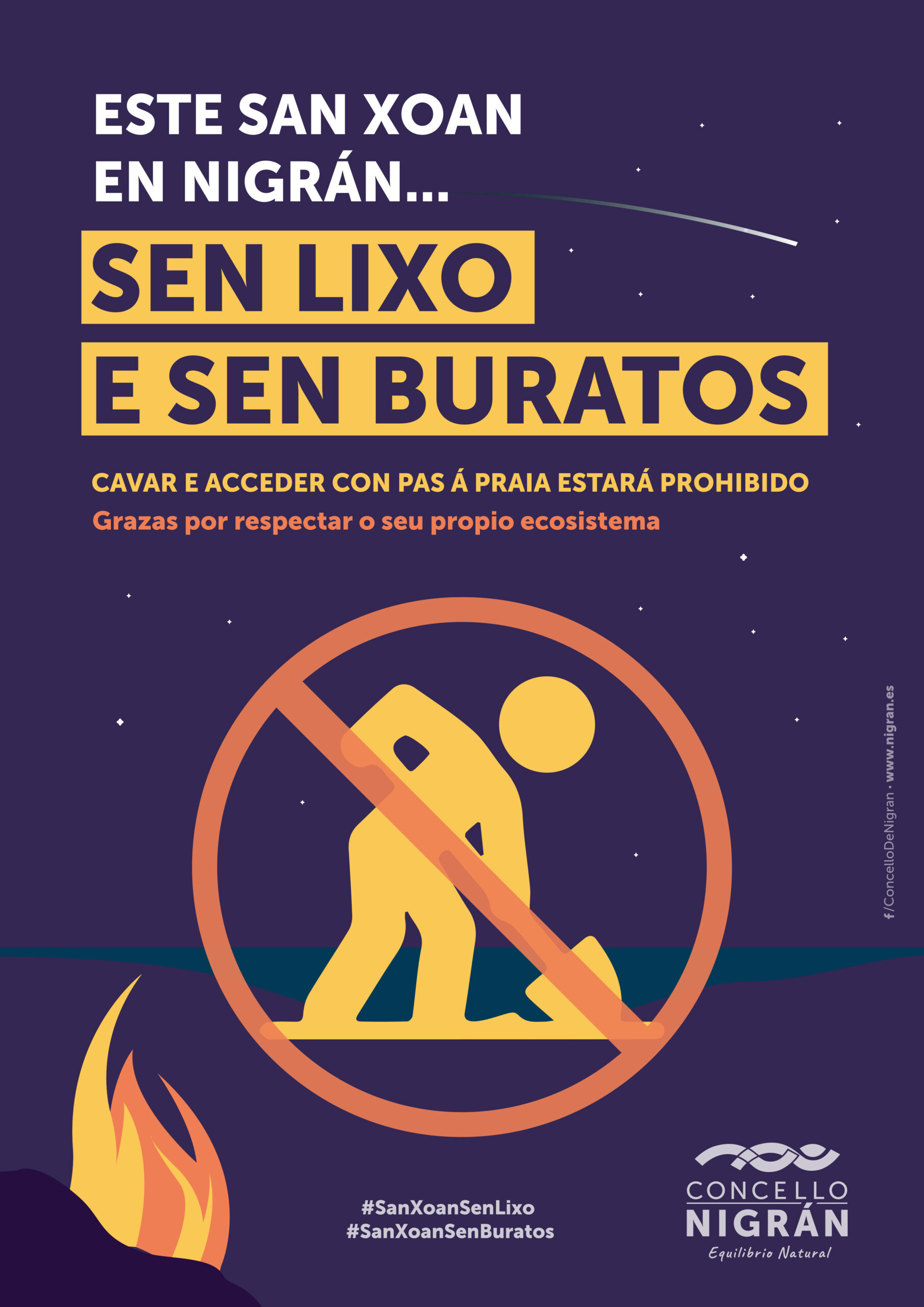 Deste xeito, o Concello de Nigrán da un paso máis sobre a campaña de #SanXoanSenLixo emprendida desde o ano 2019 advertindo que o incumprimento desta prohibición expresa acarrexará sancións que oscilan de leve a moi grave, porque afectan desde á alteración do ecosistema litoral ata unha infracción da lei de seguridade cidadá. Toda esta información será achegada á mocidade da contorna mediante cartalería específica, vallas, cuñas e anuncios publicitarios, banners en redes sociais, gifs… “Precisamos que a mensaxe chegue a toda a cidadanía para que o propio día de San Xoan xa saiban que non van poder acceder á praia con pás, sachos ou material contundente”, explica o alcalde, quen pide a colaboración de toda a veciñanza na súa difusión.