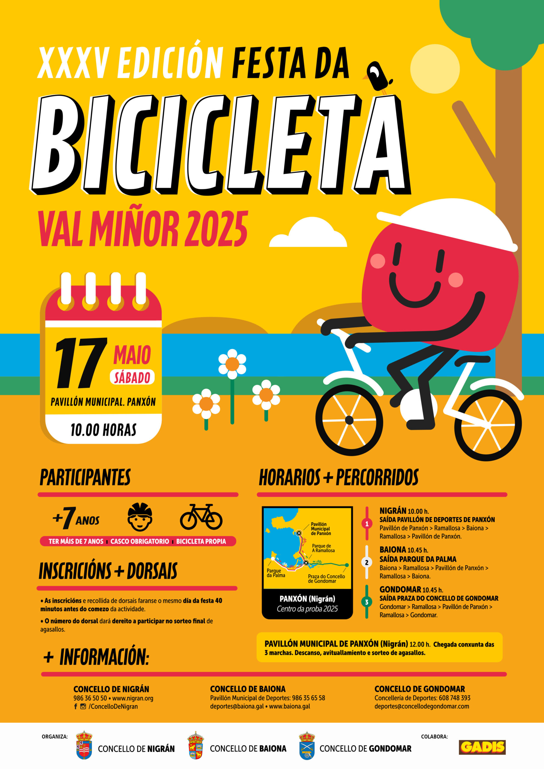 Nigrán, 05/05/25- Os tres concellos do Val Miñor, Nigrán, Baiona e Gondomar, volverán pedalexar xuntos o próximo sábado 17 de maio para festexar a tradicional Festa da Bicicleta na súa 35 edición, evento que foi presentado hoxe no Pavillón de Panxón por ser este ano Nigrán o municipio anfitrión. O obxectivo, un ano máis, é promover entre a poboación o deporte e a socialización como hábitos saudables.